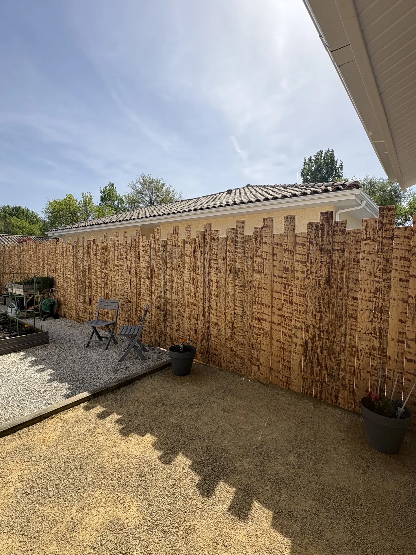 Au-delà de son aspect esthétique, cette clôture haut de gamme en croûte de pin à Sanguinet dans les Landes offre de réels bénéfices : elle permet de limiter les vis-à-vis, de structurer les espaces extérieurs et de créer une ambiance plus intimiste autour de votre maison ou de votre terrasse. Elle participe également à la valorisation globale de votre propriété, avec un rendu qualitatif immédiatement visible.