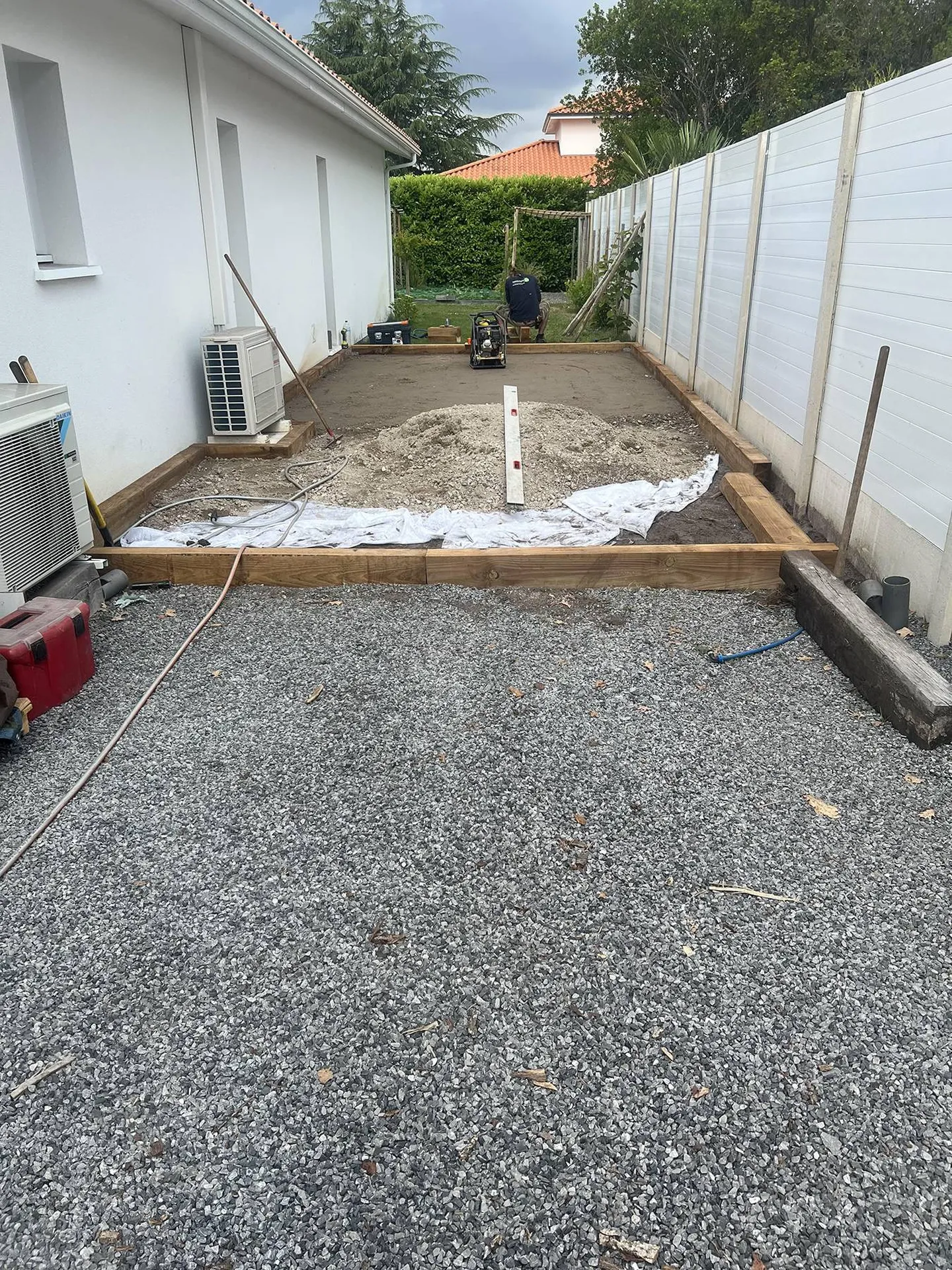 - Etalement, nivellement et compactage du concassé à l'aide d'une plaque vibrante pour une surface stable et uniforme.