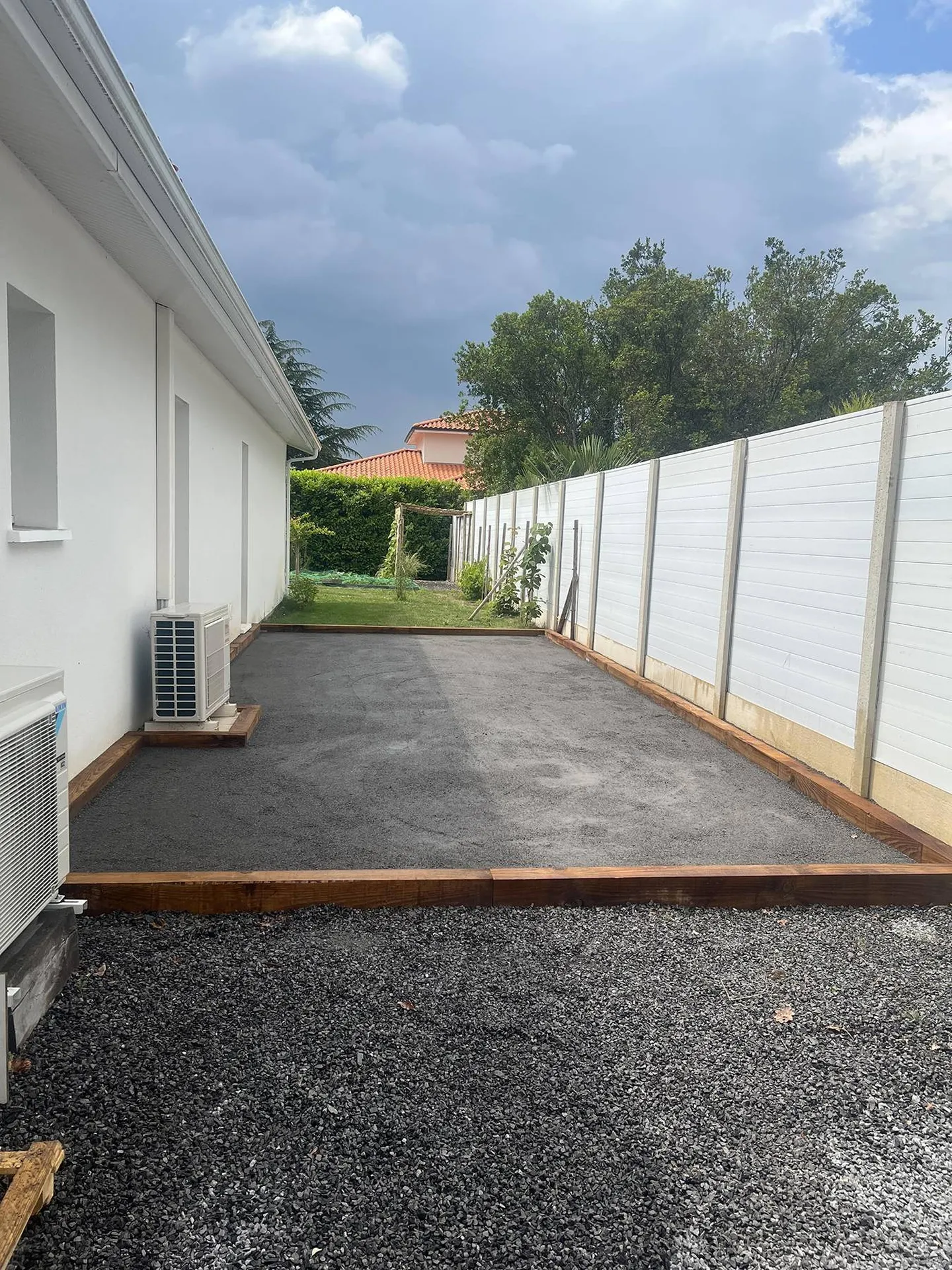 L'arrosage du sol a permis une meilleure compaction avec la plaque vibrante, garantissant une surface homogène et durable. Nos clients peuvent désormais profiter pleinement de leur nouveau terrain de pétanque sur mesure, conçu pour des moments de détente et de convivialité inoubliables.