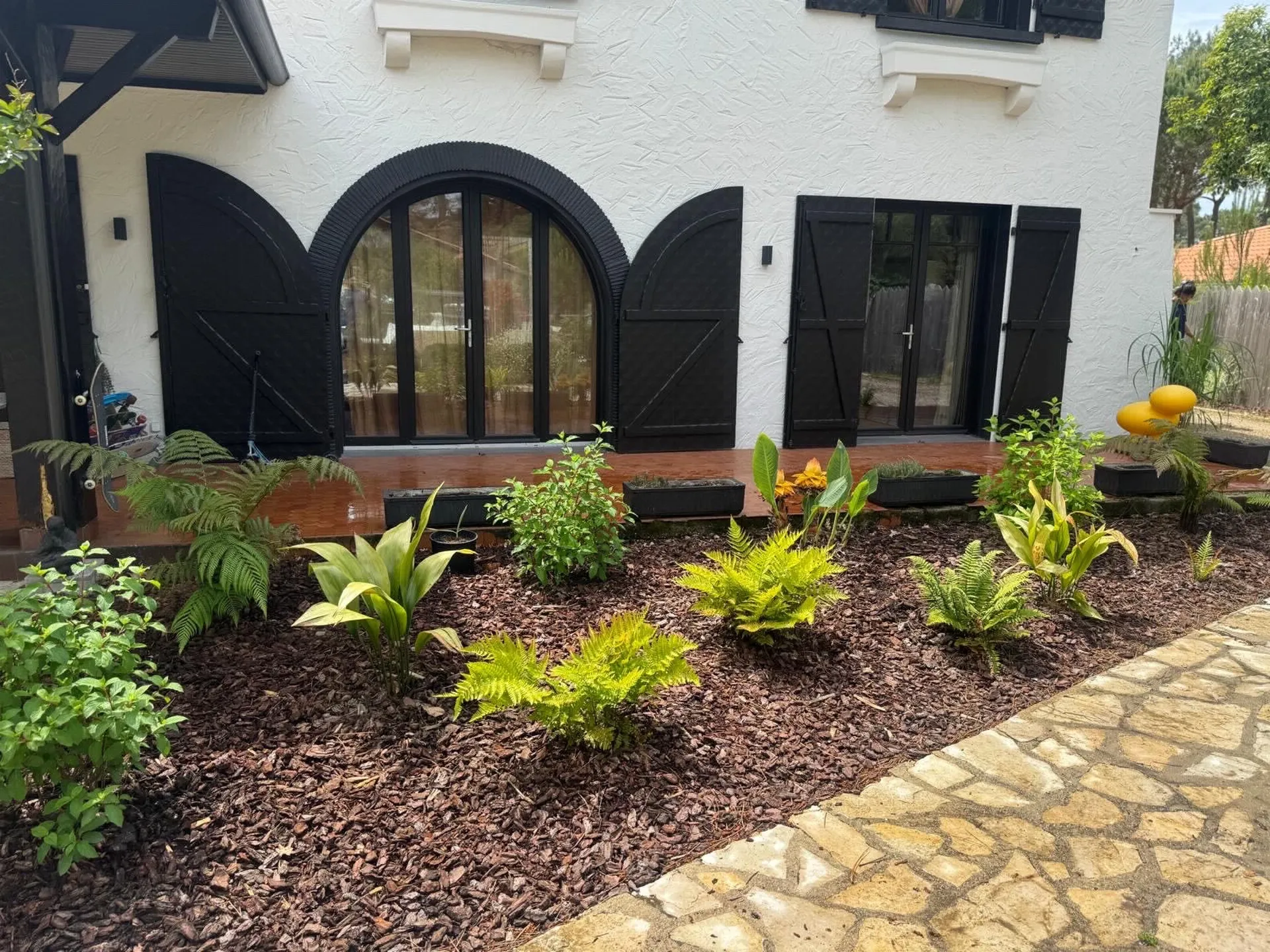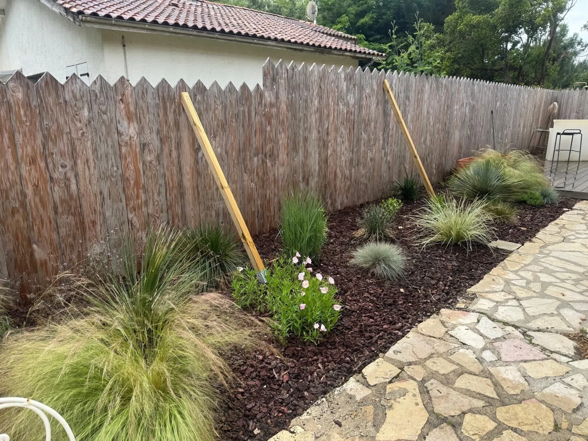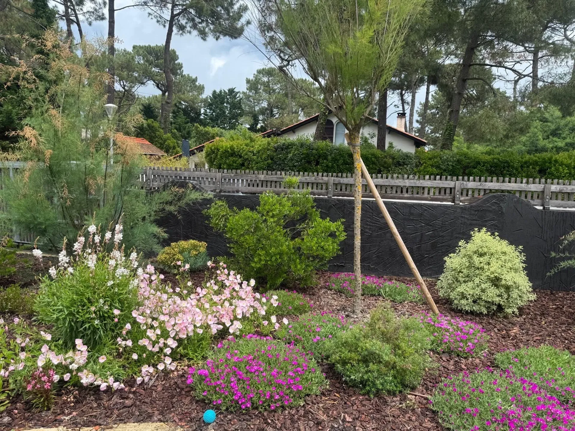 Création de massif paysager avec paillage et plantes variées à Mimizan