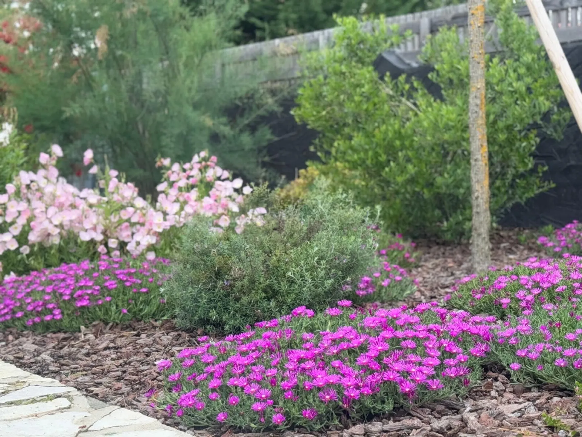 Pour garantir une croissance optimale et limiter l’arrosage manuel, nous avons installé un arrosage goutte-à-goutte discret et parfaitement intégré dans le massif. Le paillage en écorces de pin assure, quant à lui, une protection efficace du sol, limite les mauvaises herbes et renforce l’aspect naturel de la composition.