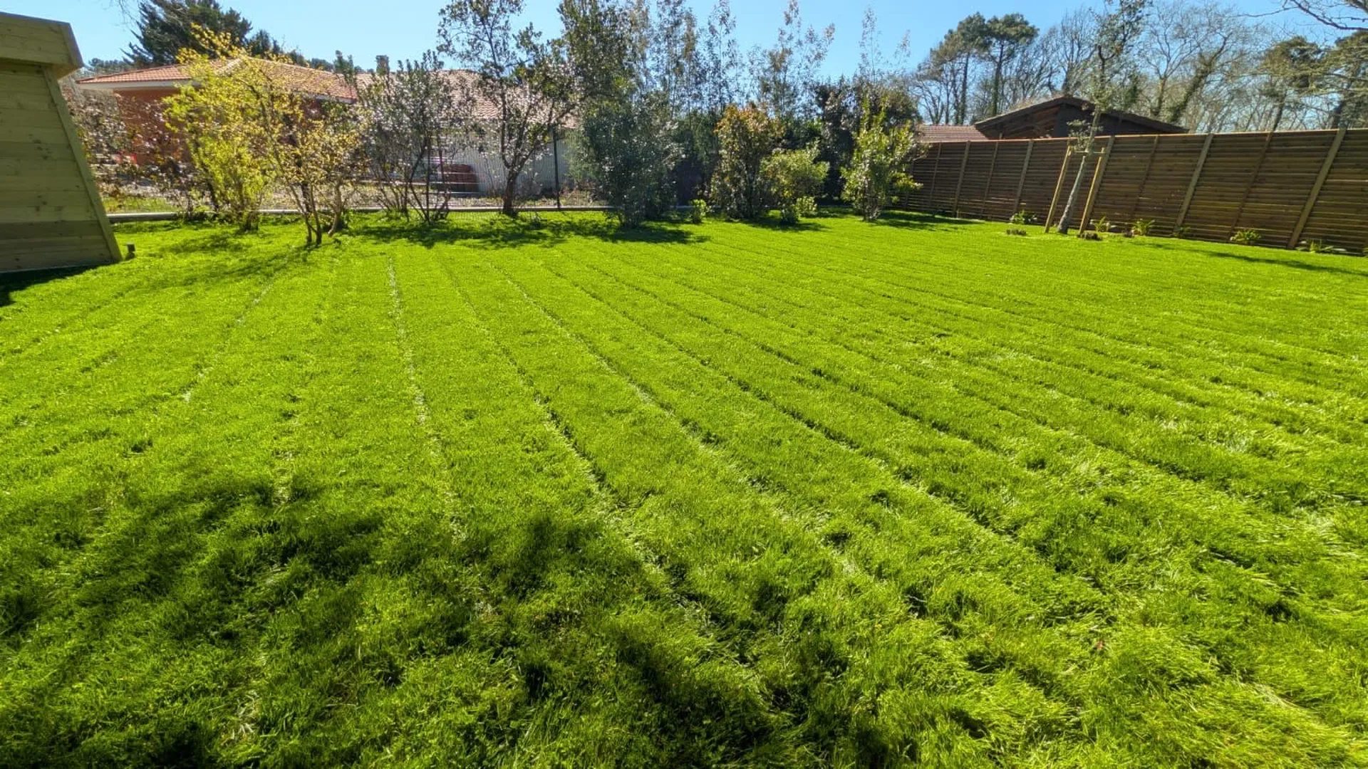 Chez Évolution Paysage, nous réalisons régulièrement la pose de gazon micro-trèfle à Parentis-en-Born, Biscarrosse et Sanguinet, une solution à la fois esthétique, durable et adaptée aux sols sableux des Landes.