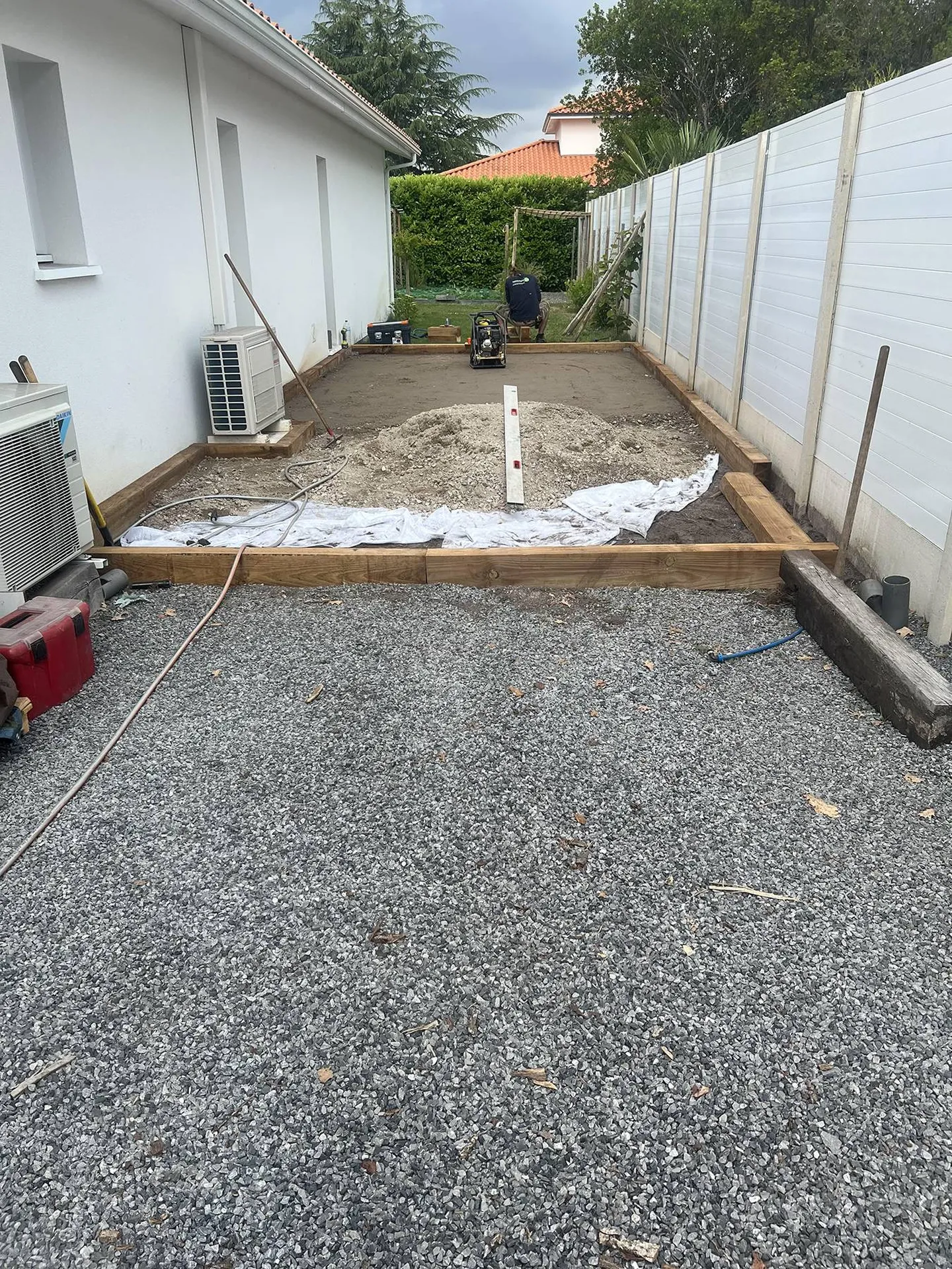 La réalisation du terrain de pétanque a suivi un processus méthodique pour garantir un résultat de qualité. Tout d'abord, nous avons délimité la surface en utilisant un cordeau pour avoir des lignes bien droites. Ensuite, nous avons procédé au décaissement du sol, suivi de l'évacuation de la terre. Les traverses paysagères ont été mises en place et fixées entre elles pour délimiter la surface consacrée au jeu. Le concassé a été ensuite soigneusement étalé et nivelé, puis compacté avec une plaque vibrante pour assurer une surface solide. Nous avons également utilisé du géotextile pour prévenir la pousse de mauvaises herbes et maintenir la qualité du sol. Enfin, nous avons mis en place et nivelé le gravier de finition afin de lisser la surface et l’adapter au jeu de pétanque.